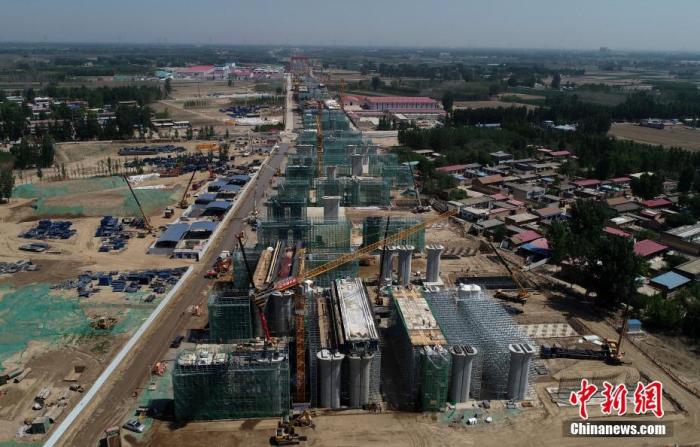 资料图:2019年5月7日,航拍京雄城际铁路雄安站施工现场。中新社记者 韩冰 摄