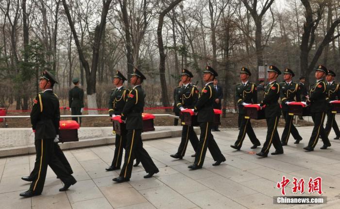 资料图:2019年4月4日,第六批在韩中国人民志愿军烈士遗骸安葬仪式在沈阳抗美援朝烈士陵园举行。中新社记者 于海洋 摄