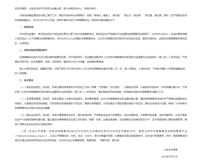 11日晚,北京市体育局网站发布《北京市体育局关于有序恢复举办体育赛事活动的通知》(《通知》)称,按照“谁审批(备案)、谁负责”“谁主办、谁负责”“谁主管、谁负责”原则,在严格落实各项防控措施基础上,自7月12日起,有序恢复举办线下体育赛事活动。据悉,恢复办赛将严格落实风险评估、实名制管理、测温、扫码验码、查验48小时以内核酸、疫苗接种等措施。