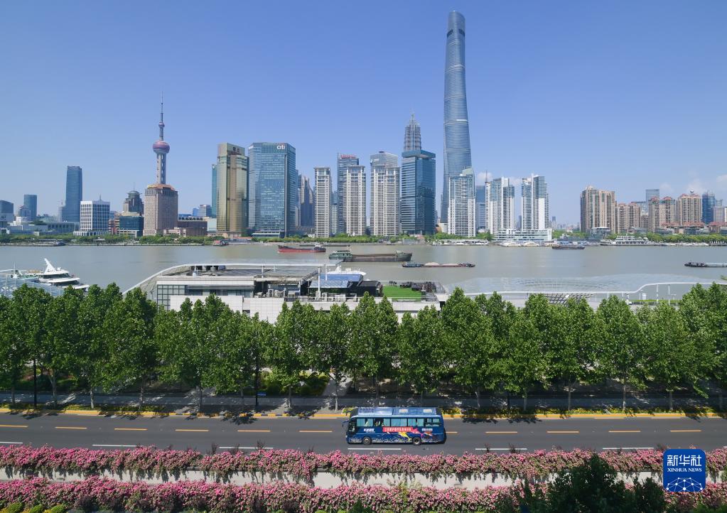 一辆载有援沪医疗队员的大巴车驶过上海外滩(5月5日摄)。新华社记者 李贺 摄