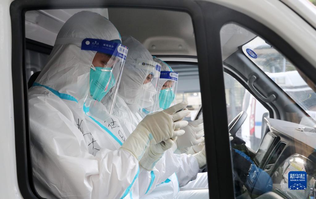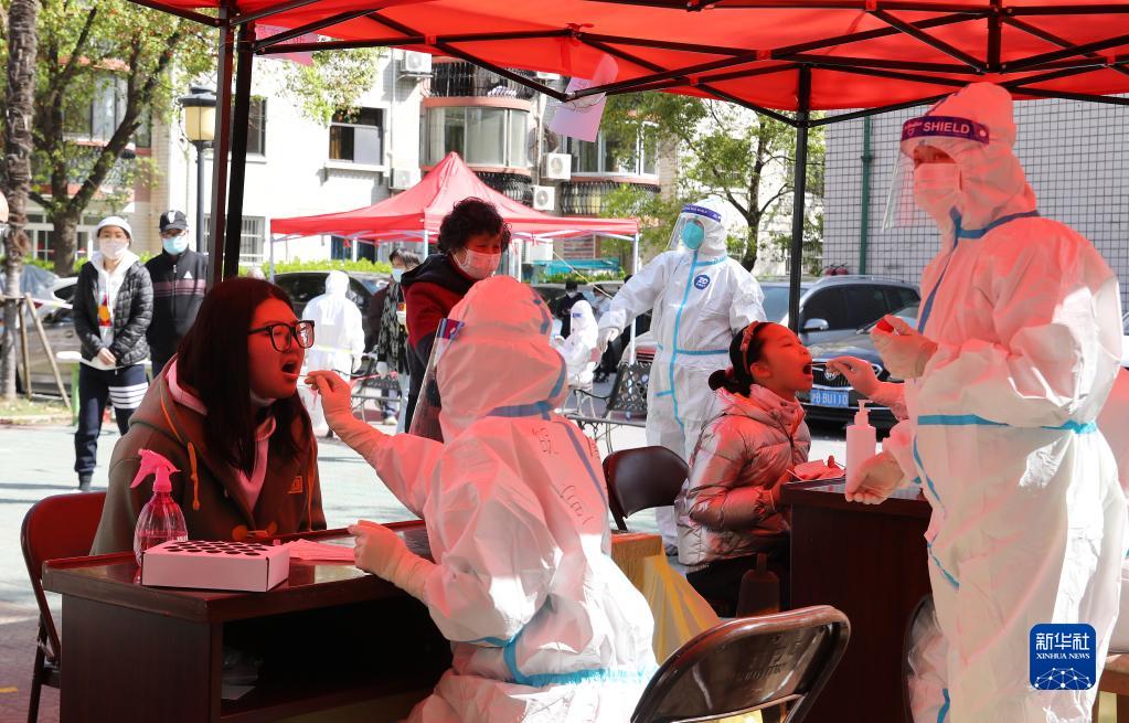 在上海市闵行区七宝镇一小区内,安徽省援沪医疗队队员为居民进行核酸检测采样(4月4日摄)。新华社记者 方喆 摄