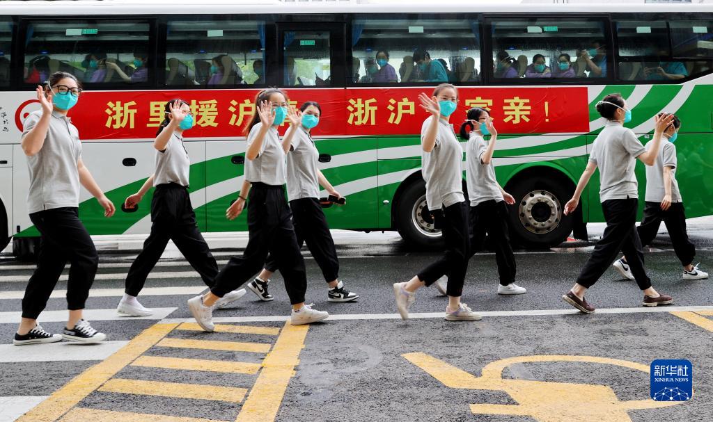 浙江省援沪医疗队队员列队走过停放在位于上海市浦东新区驻地外的大巴旁(5月24日摄)。当日,浙江省援沪医疗队圆满完成援沪任务启程返浙。新华社记者方喆 摄