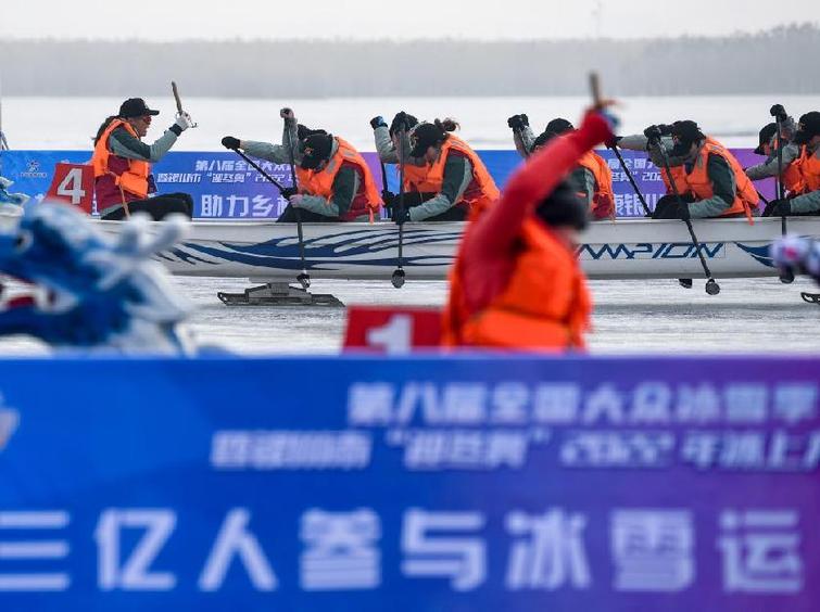 1月8日,第八届全国大众冰雪季暨银川市“迎冬奥”2022年冰上龙舟比赛在宁夏银川阅海滑雪场举行,市民在冰封的阅海湖面上参加冰上龙舟比赛。新华社记者冯开华摄