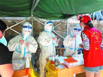 现场等待核酸检测的人群排起了长队。三伏天骄阳似火,气温逐渐升高,地面体感温度接近40℃,普通人尚且难以忍受,对全身严密防护的医护人员更是严峻的考验。他们坚守“阵地”,坚决不耽误采集工作的进行,满脸压痕但笑容不改。护目镜已经花了,双层手套里的手指被汗液泡得发白,酷热空气里汗如雨下……他们在高温下坚持,即便轮班休息时喝下再多的水都没有人上卫生间,任由水分变成汗流淌在防护服里。防护服变成了贴身的蒸笼,除了热,就是闷。但面对看不到头的长队,大家早已忘记了自己的感受,只想把检测速度加快一点,再快一点……热心的莱阳市民送来西瓜和雪糕,让医护人员深受感动,倍添动力。