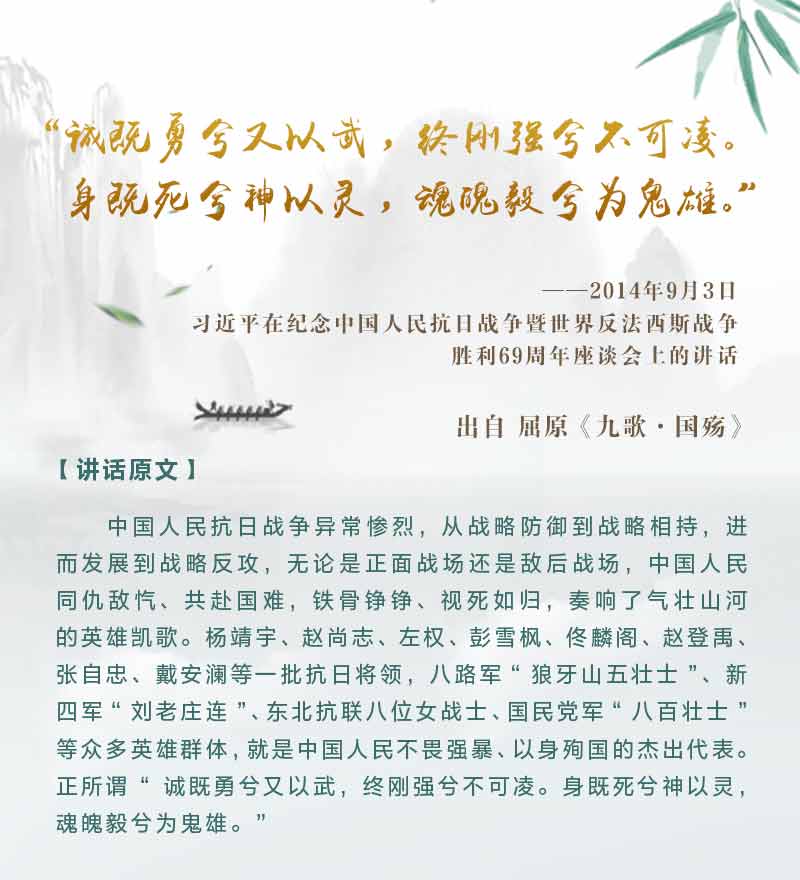 2014年9月3日,在纪念中国人民抗日战争暨世界反法西斯战争胜利69周年座谈会上,习近平缓缓念出屈原的传世名句,“诚既勇兮又以武,终刚强兮不可凌。身既死兮神以灵,魂魄毅兮为鬼雄”,盛赞中国人民同仇敌忾、共赴国难,铁骨铮铮、视死如归,奏响了气壮山河的英雄凯歌。