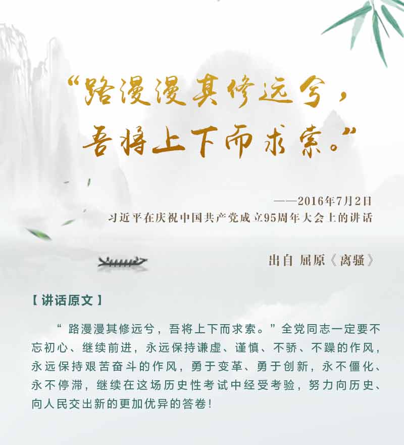 “路漫漫其修远兮,吾将上下而求索。”2016年7月,在庆祝中国共产党成立95周年大会,习近平娓娓道出屈原的名句,号召全党同志不忘初心、继续前进,勇于变革、勇于创新,永不僵化、永不停滞。