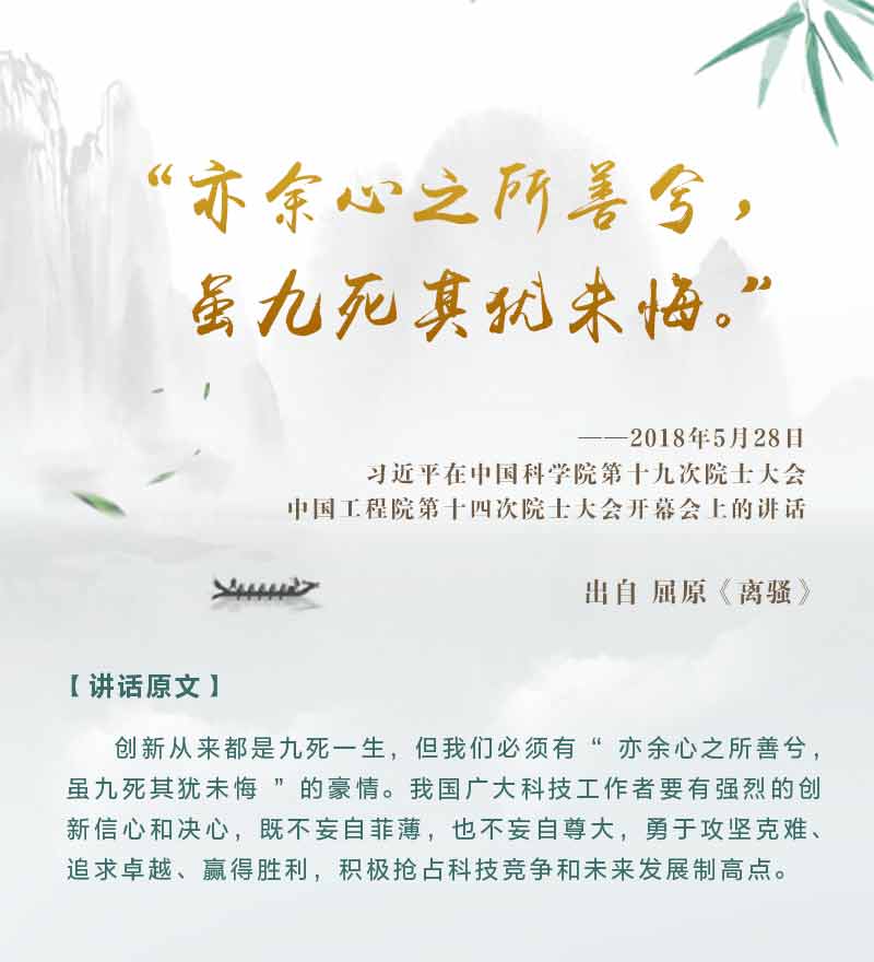 “创新从来都是九死一生。”2018年5月,在中国科学院第十九次院士大会、中国工程院第十四次院士大会开幕会上,习近平引用屈原的“亦余心之所善兮,虽九死其犹未悔”,鼓励广大科技工作者勇于攻坚克难、追求卓越、赢得胜利。