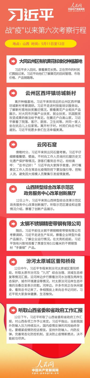 编者按:5月11日至12日,中共中央总书记、国家主席、中央军委主席习近平赴山西大同、太原等地,深入农业产业基地、移民新村、文物保护单位、改革示范区和企业等,就统筹推进常态化疫情防控和经济社会发展工作、巩固脱贫攻坚成果进行调研。