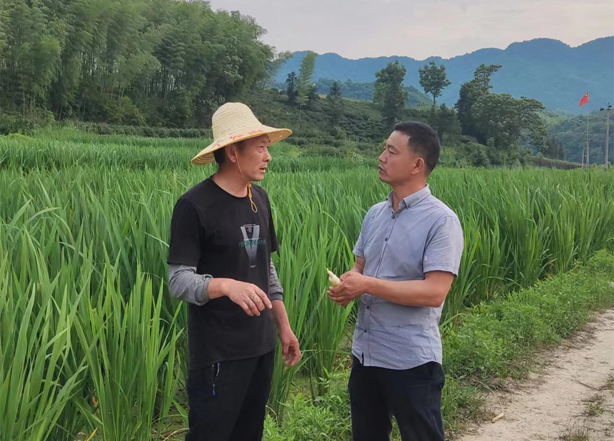 6月,春夏之交,阳光下的茭白苗绿得喜人。顶着烈日,霍山县单龙寺村党总支书记汪明亮到了大片的茭白田边,正在和种植户交流着茭白生长情况和收获计划。正值茭白收获的时节,汪明亮格外繁忙,还没到最热的酷夏,他的胳膊就已晒出了分层。