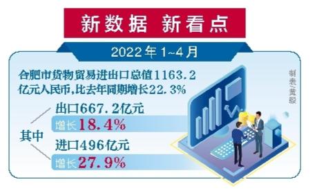 庐州海关近日发布信息,今年1~4月,合肥市货物贸易进出口总值1163.2亿元人民币,比去年同期增长22.3%,其中出口667.2亿元,增长18.4%,进口496亿元,增长27.9%,在全国省会城市中,总值排名第7位,增速排名第6位。
