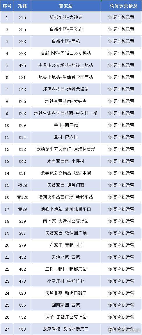 据北京公交集团官博消息,按照疫情防控工作要求,自6月7日首班车起,对途经海淀、昌平两区的27条公交线路有序恢复运营,对途经封、管控区周边站位继续采取甩站措施,具体情况见下表。后续将随相关封(管)区域解封和保障工作的落实,陆续恢复其它公交线路。请广大乘客关注相关出行提示,提前安排出行计划,乘车时遵守防疫要求。