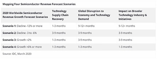 根据IDC近日发布的《新冠病毒对全球半导体市场预测的影响》报告,经历了疫情之后的全球半导体行业继续大幅缩水的可能性达80%。他们认为2020年半导体行业的营收甚至会同比下跌6%~12%,这对全球半导体市场的影响达258亿美元。