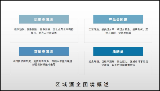 虽然区域酒企已经在市场、资源、消费者心智的占据上有了一定的基础。但来自组织、产品、营销以及战略等四个层面的困境依然突出。那么如何发挥自身优势、整合自身资源,以达到迅速脱困的目的将是我们今天讨论的重点。