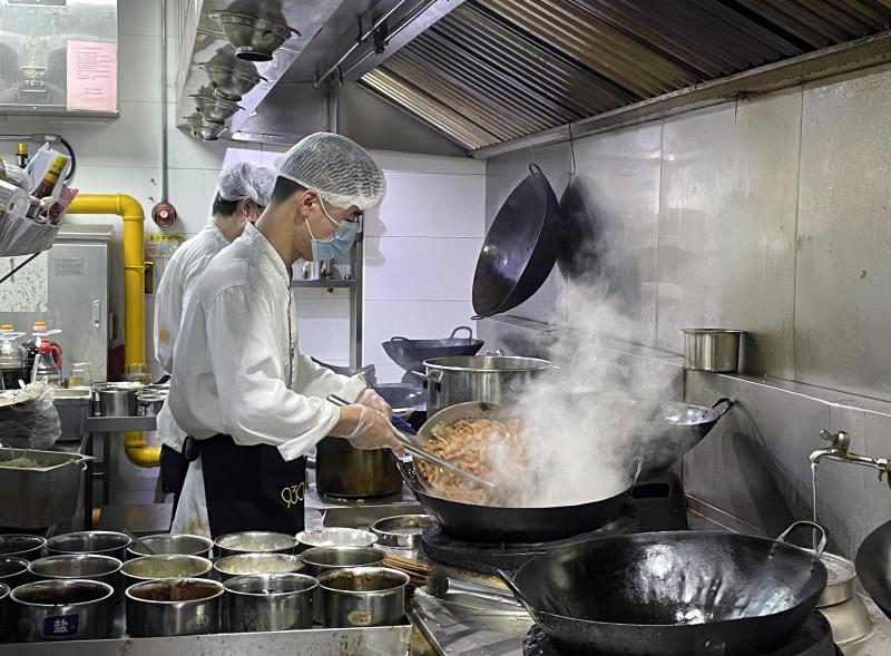 例会过后,20多名员工各就各位,后厨响起洗刷、切菜的声音,灶火旺起来,油锅滋滋作响,店里热气腾腾。