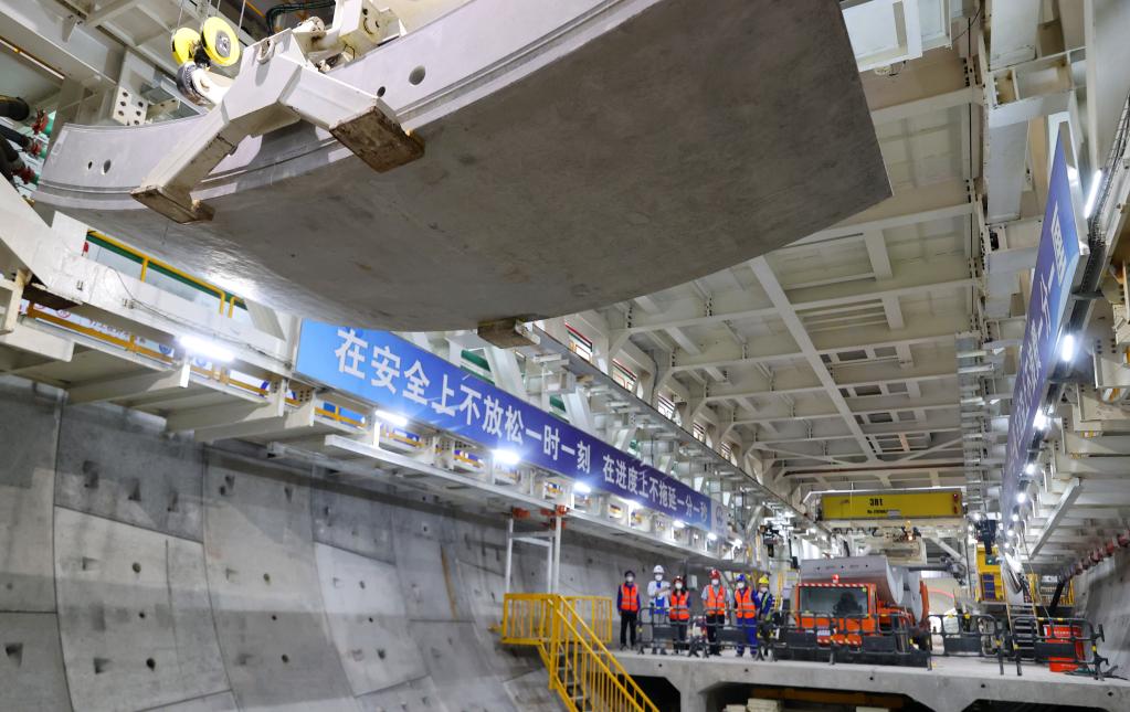 5月28日,在上海轨道交通市域线机场联络线工程11标段,工人在操作管片吊机进行施工作业。新华社记者 方喆 摄