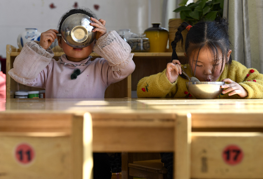 ↑宁夏吴忠市盐池县针对农村幼儿和特殊教育学生实施营养改善计划,普及免费营养午餐。这是4岁的孙月月(左)和周诗茹在盐池县高沙窝镇幼儿园享用免费营养午餐(2019年11月26日摄)。