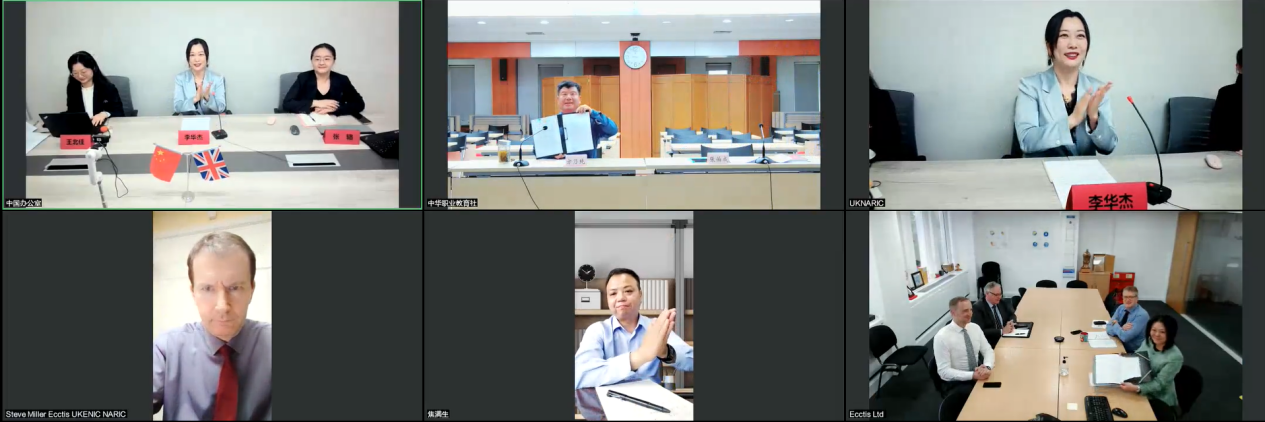 2022年5月31日,中华职业教育社与英国国家学历学位评估认证中心UK ENIC(原UK NARIC)在线举行合作备忘录云签约仪式。中华职业教育社总干事方乃纯、联络部负责人张伯成,英国国家学历学位评估认证中心首席执行官白云博士、机构事务负责人约翰·威廉姆斯、商务部负责人克里斯·斯蒂芬斯、全球伙伴关系负责人史蒂夫·米勒、商务拓展经理亨利·胡吉特、中国首席代表李华杰、UK NARIC中方理事会秘书长焦满生出席了此次云签约仪式。