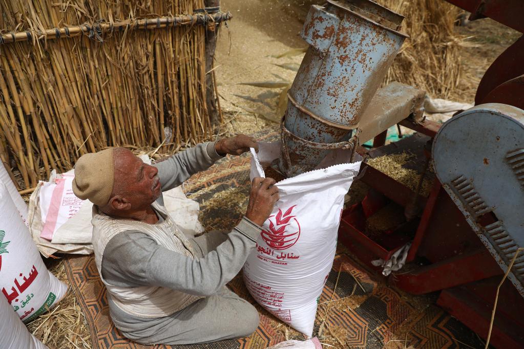 4月30日,农民在埃及米努夫省将脱壳的小麦装袋。新华社发(艾哈迈德·戈马 摄)