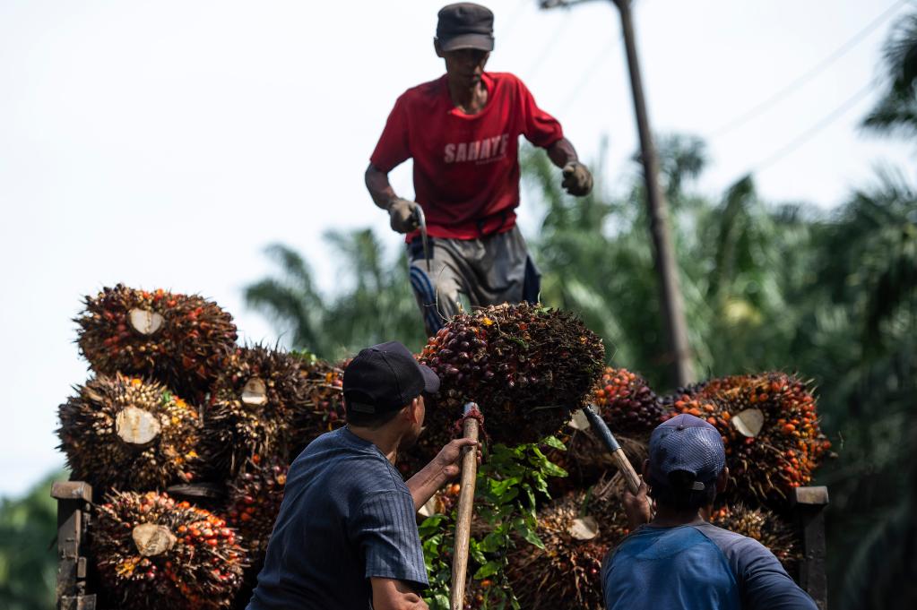 4月26日,在印度尼西亚茂物一处油棕种植园,工人们将收获的棕榈果装运到卡车上。全球最大棕榈油生产国印度尼西亚日前宣布,从4月28日起暂停出口棕榈油系列产品。新华社发(维里摄)