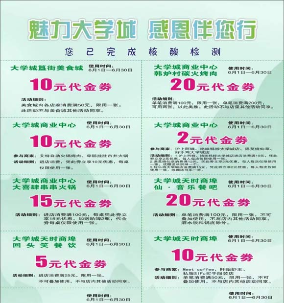 你做核酸,我送礼遇。为感谢广大居民对疫情防控的配合与支持,感恩社会对大学城街区工作的支持,让市民享受大学城美食街商户专属优惠福利,给广大市民带来实实在在的利好。