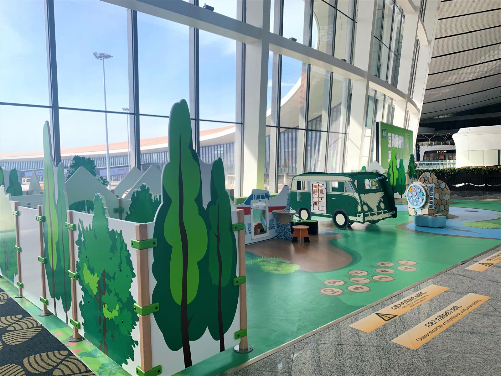 打造“小旅客”的出行乐园。在大兴机场航站楼B指廊设置有一处“儿童乐园”,该区域为儿童活动区,结合小朋友喜爱的卡通元素,设计了树林小屋、宇宙飞船和动物软凳等儿童娱乐设施,环境生动有趣,给小朋友的出行带来了惊喜和欢乐,也可以科学锻炼儿童的四肢协调、手眼协调等能力,让旅客在候机时享受亲子时光。此外,航站楼二层混流区西侧C型柱下还设置有儿童迷宫乐园,以植物迷宫为主题,打造绿色、自然的儿童乐园,为“小旅客”们提供了一个充满奇趣的室内小迷宫。同时,大兴机场航站楼内配备了充足的卡通造型童趣车、儿童车、自助婴儿车等,不仅让家长旅客出行解放双手,也为“小旅客”们带来了出行快乐。疫情期间,儿童活动区附近配备了无接触感应免洗洗手液,机场保洁人员在儿童使用之后进行及时消毒,手推车也做到“一客一消”,消毒液配比也更加温和,确保“小旅客”接触更安全。