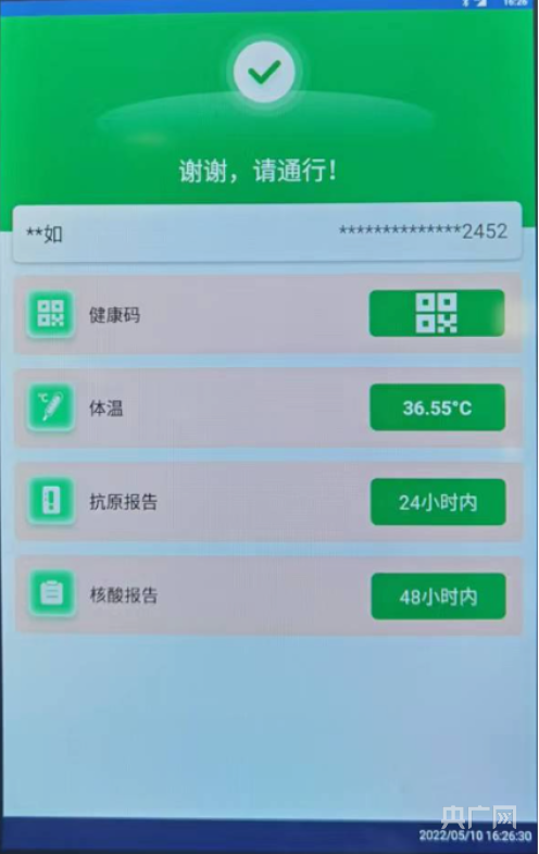 具体操作:刷身份证后,“数字哨兵”设备从后台实时获取健康核验数据,将结果显示在屏幕上,并自动完成信息登记。