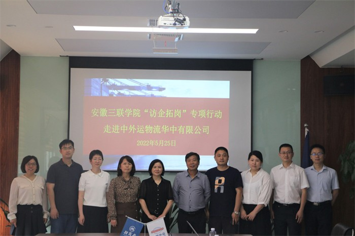 为深入贯彻稳就业、促就业决策部署,增强就业工作实效,5月25日下午,安徽三联学院访企拓岗促就业专项行动走进中外运物流华中有限公司,三联学院副校长蔡文芬、就业创业处处长程学华及经济管理学院执行院长占海文、副院长郝西文参加活动。