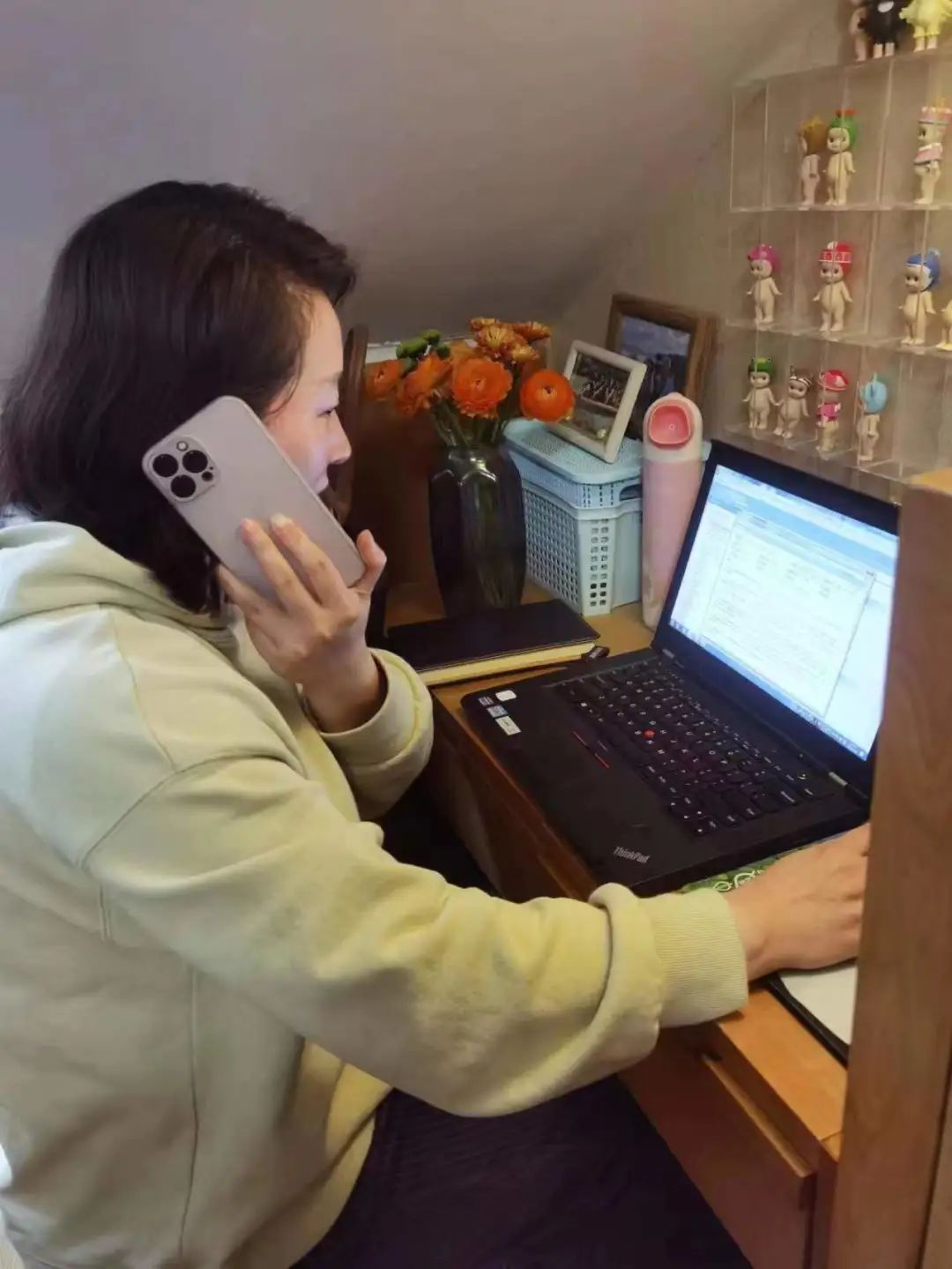 图为于赟在家里工作,及时处理群众来电诉求。