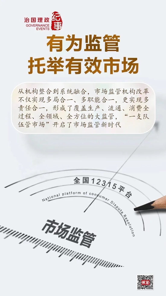 近十年来,市场监管由事后监管转变为事中、事后监管,关口前移提升监管效能;通过调整政府机构成立市场监管总局,形成大市场、大监管格局;逐步理顺市场监管队伍和监管链条,实现“一支队伍管市场”;以有效市场监管促营商环境改善,助力培育高质量的活跃市场主体,近10年中国净增1亿户市场主体;降低市场准入门槛和制度性交易成本,深入开展质量提升行动,营造放心消费环境……市场监管理念、思路、方式的一系列重大变革和生动实践,大幅提升了我国的市场监管效能,支撑着中国经济社会加快迈向高质量发展。