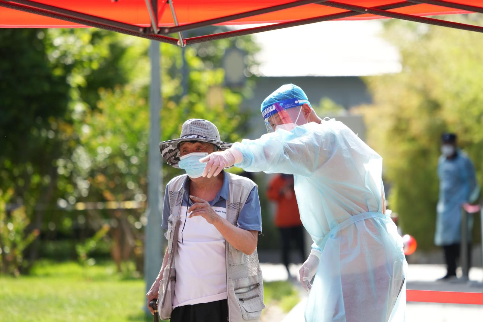 共青团员、青年志愿者姜宽在北京朝阳区八里庄街道十里堡社区的入口进行测温和健康码查验(5月26日摄)。新华社记者 李欣 摄