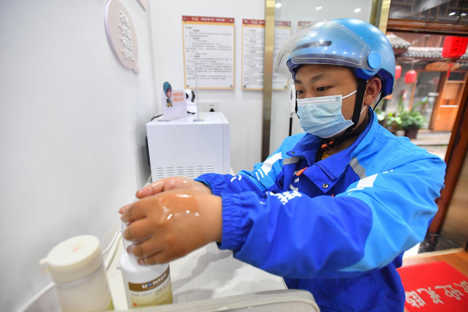 5月26日,一名外卖员在长沙市天心区“快递外卖小哥红色之家”天心阁站消毒手部。新华社记者 陈泽国 摄