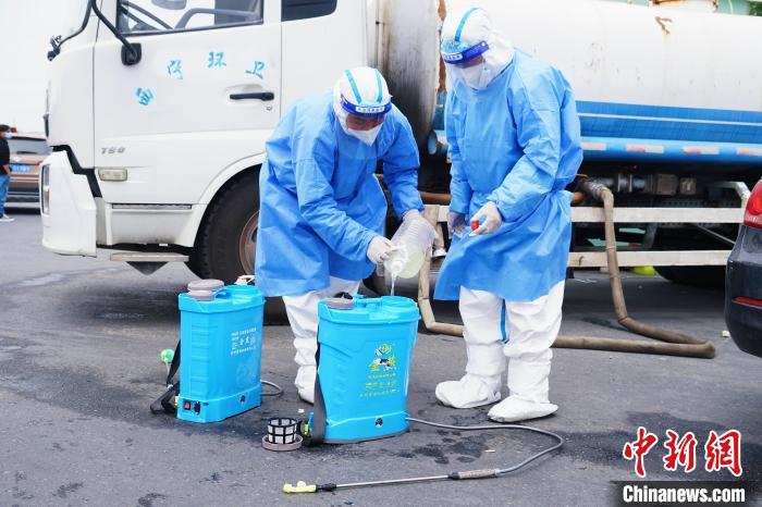 图为环卫部门工作人员做消杀前的准备工作。 马铭言 摄