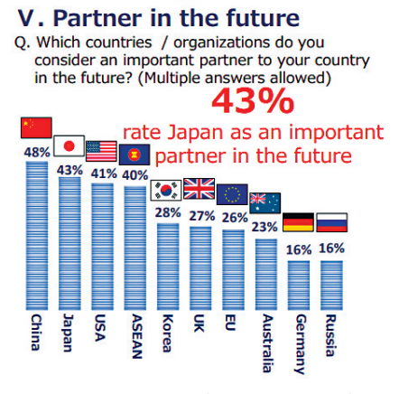 这项民调是日本外务省委托益普索集团开展的,采访对象是2700名18岁至59岁的东盟国家民众,不过此次民调没有包括缅甸。结果显示,中国成为东盟民众眼中“今后最重要的伙伴”,排名第二和第三的依次是日本(43%)和美国(41%)。相较于2019年进行的民调,选择日本的受访者比例下降了8%,选择美国的上升了4%。
