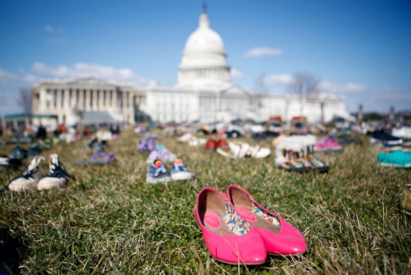 2018年3月13日,7000双代表自2012年美国康涅狄格州桑迪胡克小学枪击案以来枪击事件中遇难儿童的鞋子摆放在华盛顿国会山前的草坪上。人们以这种无声的方式,抗议国会面对枪击频发现状的不作为,呼吁枪支改革以保障儿童安全。新华社发(沈霆摄)
