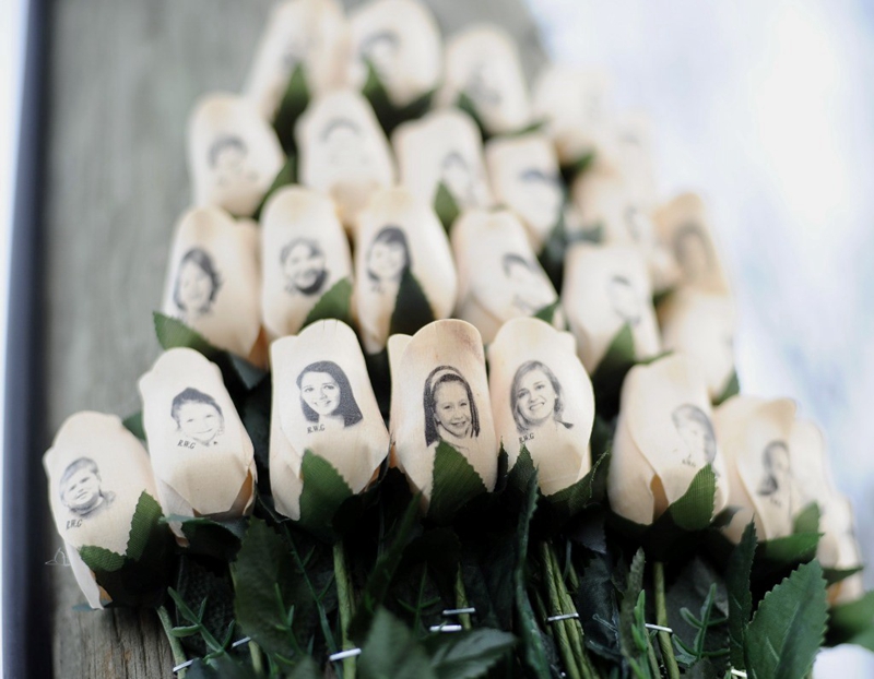 2013年1月14日,美国康涅狄格州桑迪胡克小学附近摆放着印有枪击案遇难者肖像的玫瑰。新华社发