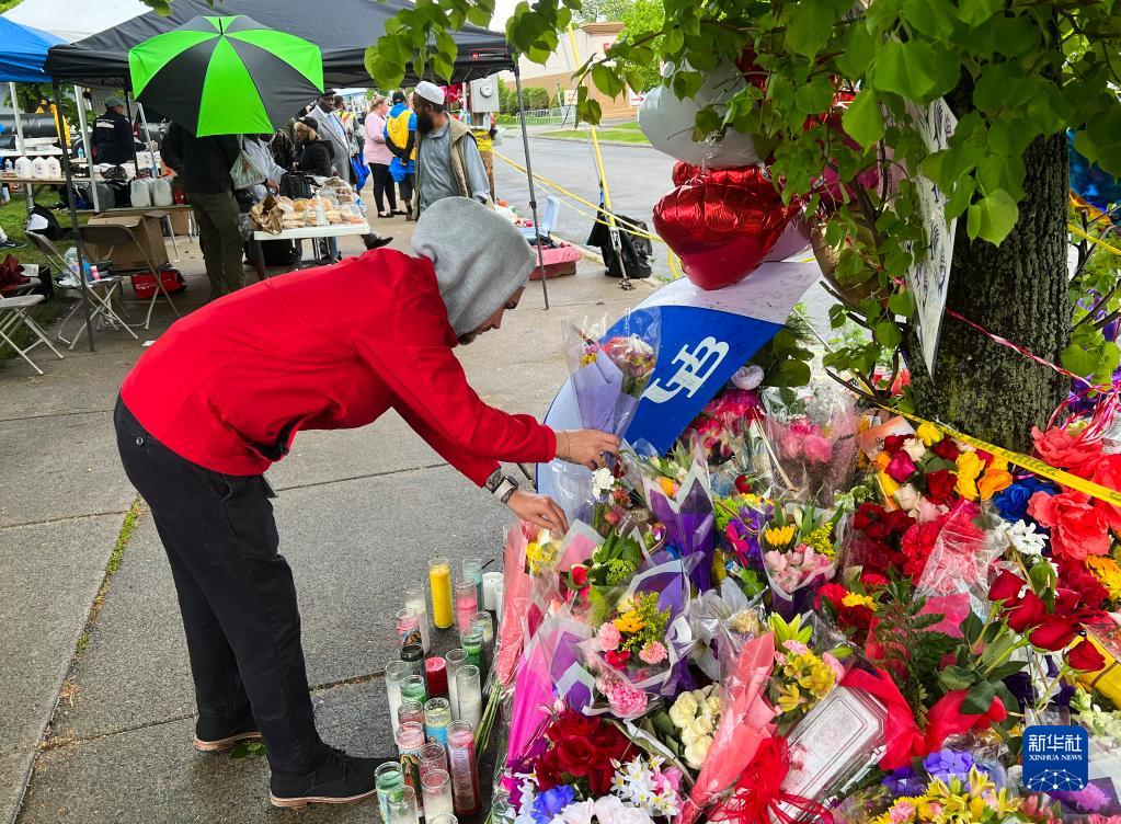 5月16日,在美国纽约州布法罗市,一名男子摆放花束悼念枪击事件遇难者。美国纽约州布法罗市一家超市14日发生枪击事件,造成至少10人死亡、3人受伤。新华社发(张杰 摄)
