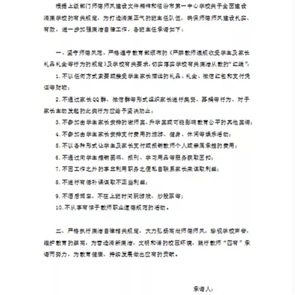 老师们郑重承诺:作为人类灵魂的工程师,一定要坚持廉洁从教的作风。虽然这个职业很平凡,但我们的使命不平凡,因为我们的脊梁支撑的是祖国的未来,虽然这个职业很清贫,但我们的双手托起的是明天的太阳。只有真正做到廉洁从教才能称得上是真正意义上的太阳底下最光辉的职业。所以,在工作中,要更加严格要求自己,依法执教、廉洁从教、立足岗位、服务学生、为人师表,努力做一名人民满意的教师。