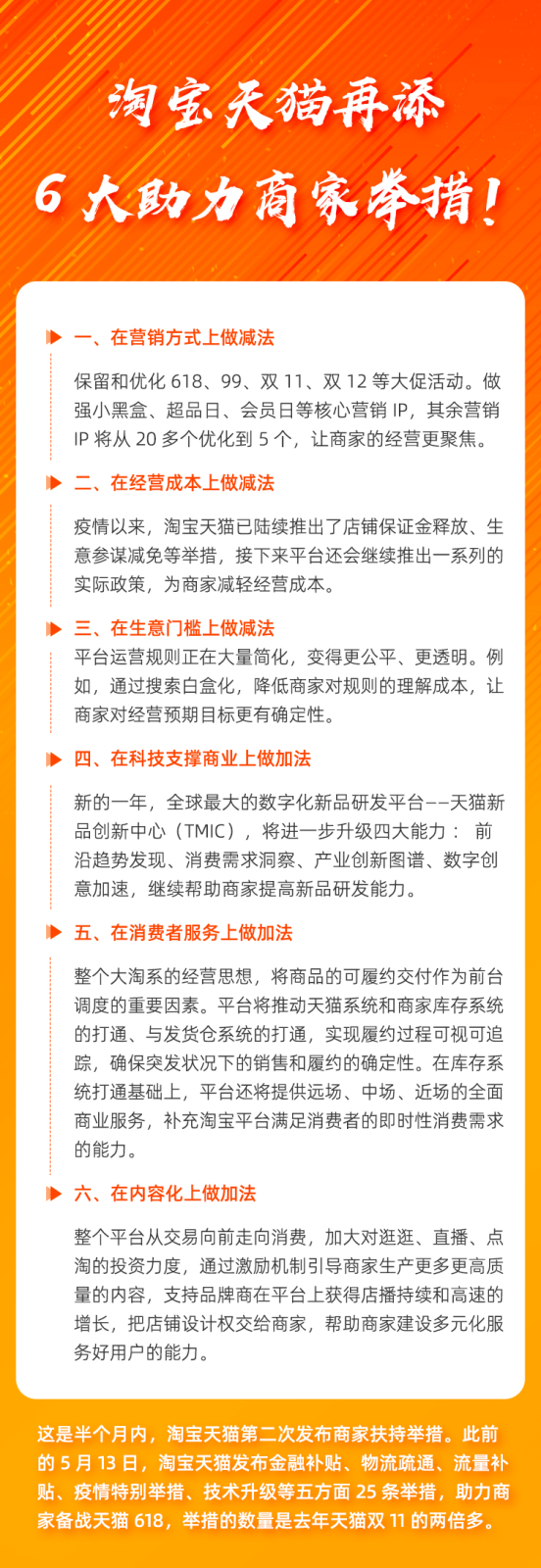 这是半个月内,淘宝天猫第二次发布助力商家举措。此前的5月13日,淘宝天猫发布金融补贴、物流疏通、流量补贴、疫情特别举措、技术升级等五方面25条举措,助力商家备战天猫618,举措的数量是去年天猫双11的两倍多。