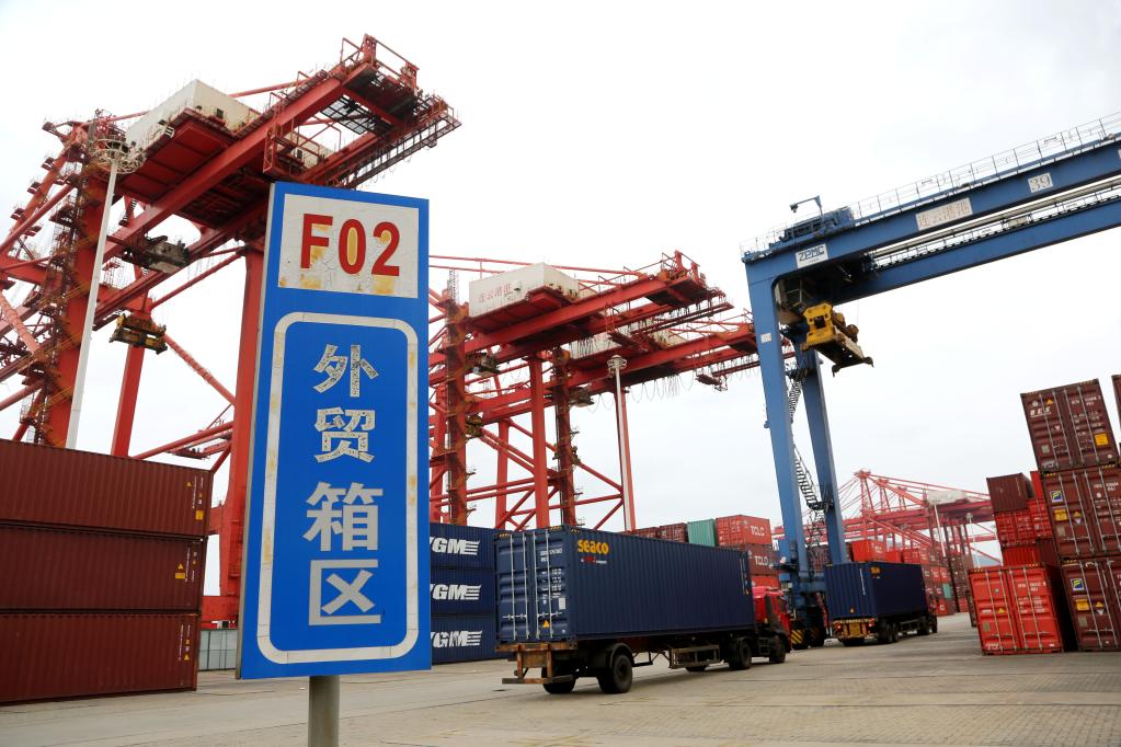 5月9日,在江苏省连云港港集装箱码头,运输车辆向货轮转运集装箱。新华社发(王春摄)