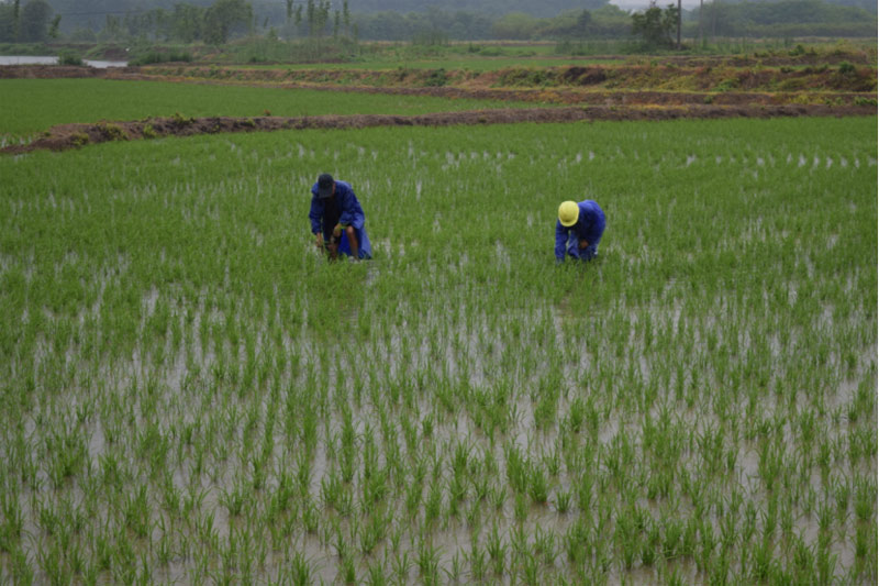 肥西县潜南灌区花岗镇农民冒雨在补秧