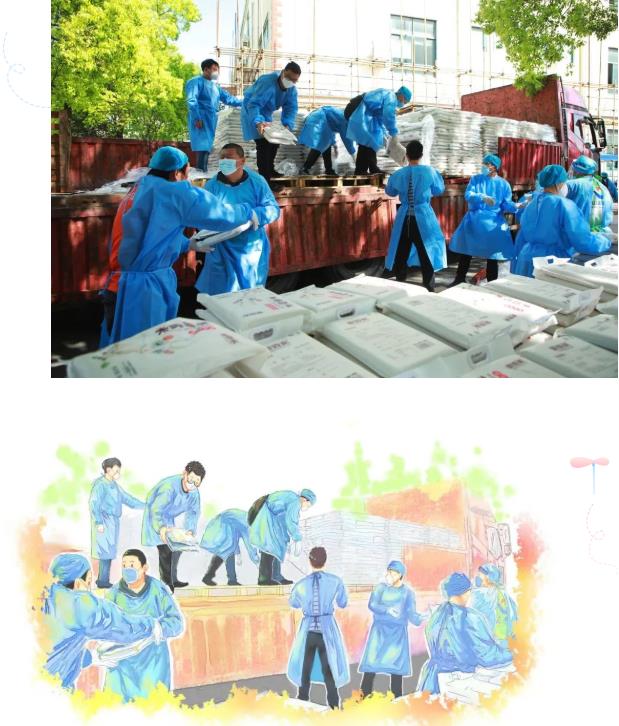 穿戴整齐的志愿者和工作人员,正齐心协力地把上百箱生活物资搬下车,再经过清点分类,按照区块专人运送,发放到每一位居民的手里。