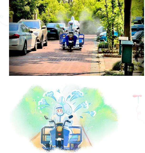 “人—物—环境”同防,遏制疫情蔓延状态,筑牢疫情防控屏障。消杀队开展“全方位、地毯式”环境消杀作业,实现“应消尽消”。
