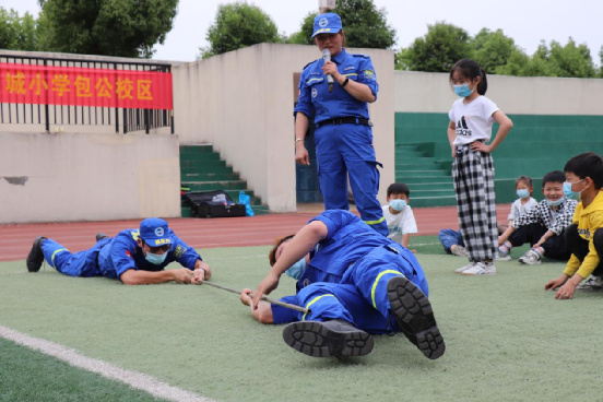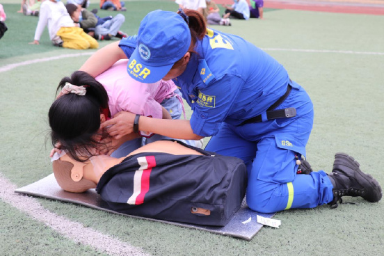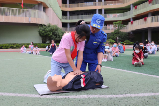 溺水救治实操是本次宣讲的重要环节。蓝天队长带领领队员们进行溺水自救的模拟演练,利用各种道具,模拟溺水时的不同情景,一一进行自救和他救方法的讲解和操练,将学校中传统的防溺水安全教育,栩栩如生的展现给学生们,从课内走向课外,真正学以致用。