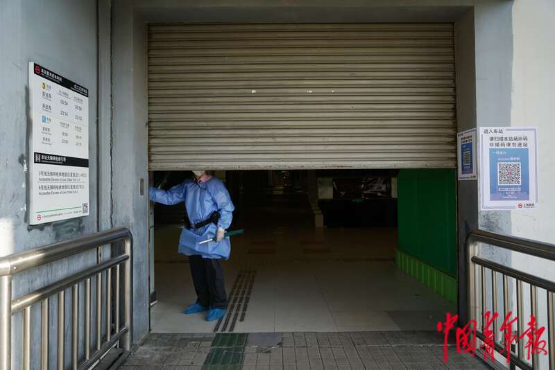 5月22日,上海地铁虹口足球场站,早上7点过后,一名地铁工作人员打开地铁入口的卷帘门。中青报·中青网记者 李强/摄