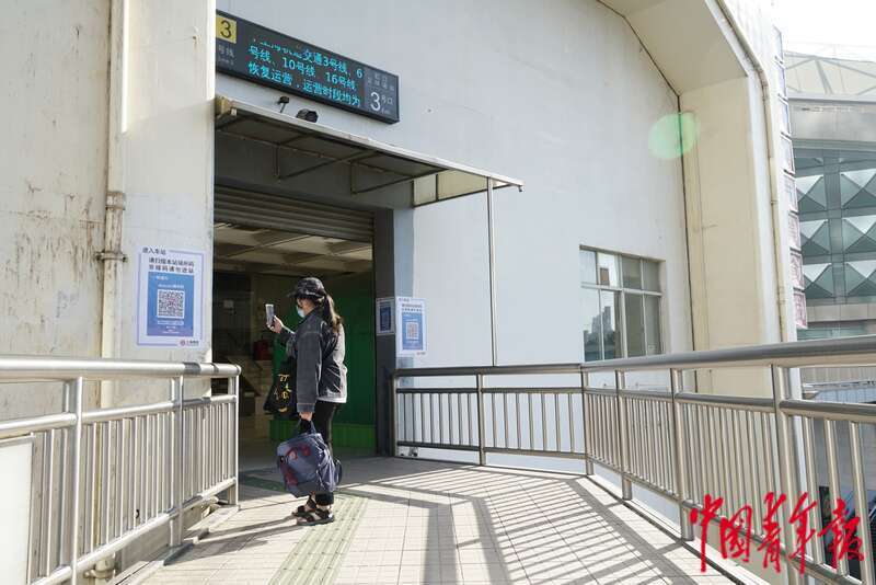 5月22日,上海地铁虹口足球场站,当天该站的首位乘客扫“场所码”进站。她将去往虹桥火车站,回安徽老家。中青报·中青网记者 李强/摄