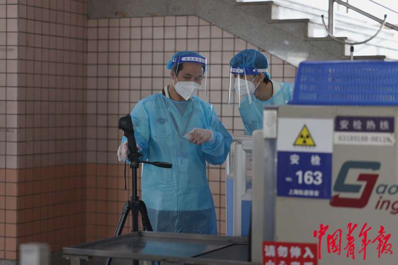 5月22日,上海地铁虹口足球场站,地铁站工作人员正在安检口调试红外测温设备。中青报·中青网记者 李强/摄