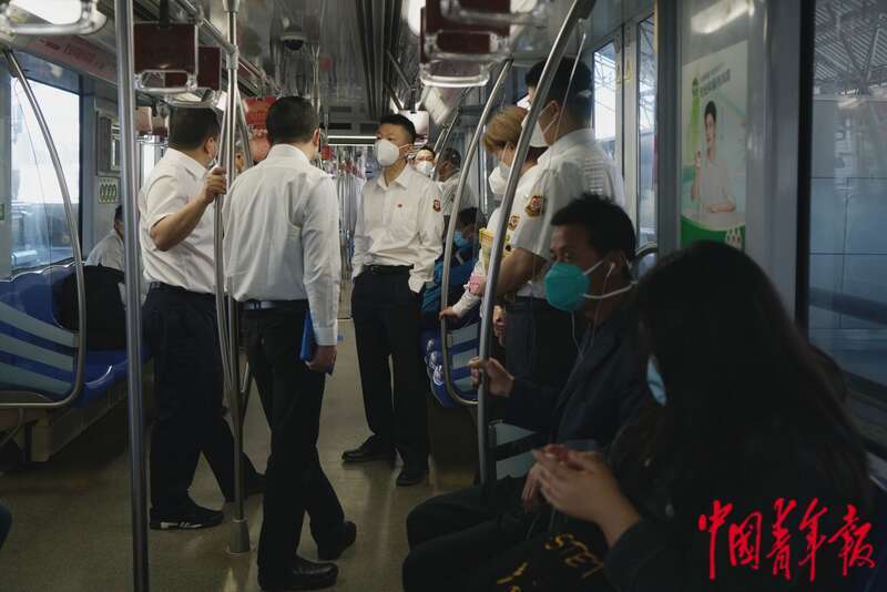 5月22日,上海地铁3号线,上海地铁公司的工作人员乘坐3号线首班车,随车查看复运首日乘车情况。中青报·中青网记者 李强/摄