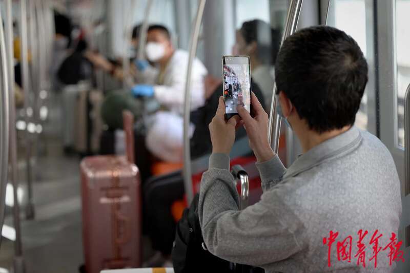 5月22日,上海地铁3号线,一名乘客拿起手机拍摄地铁3号线复运首班车内的场景。中青报·中青网记者 李强/摄