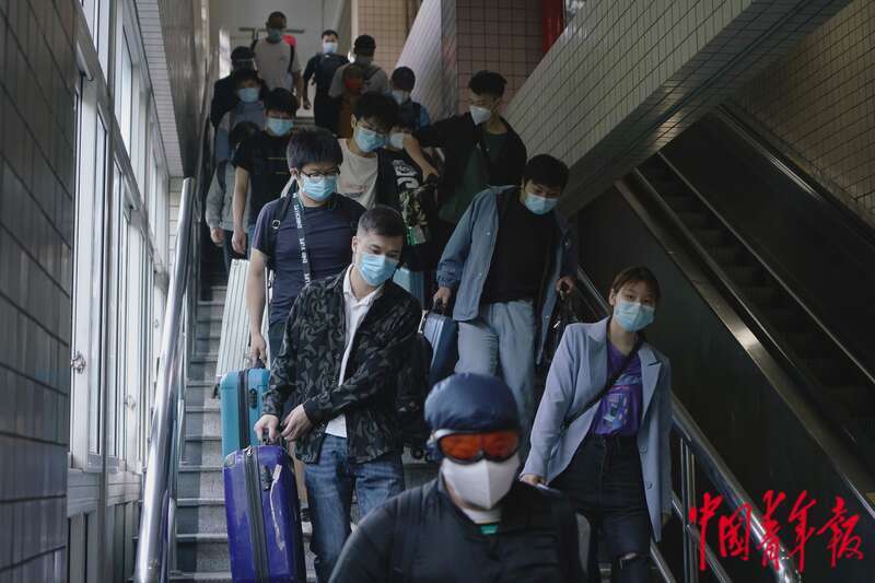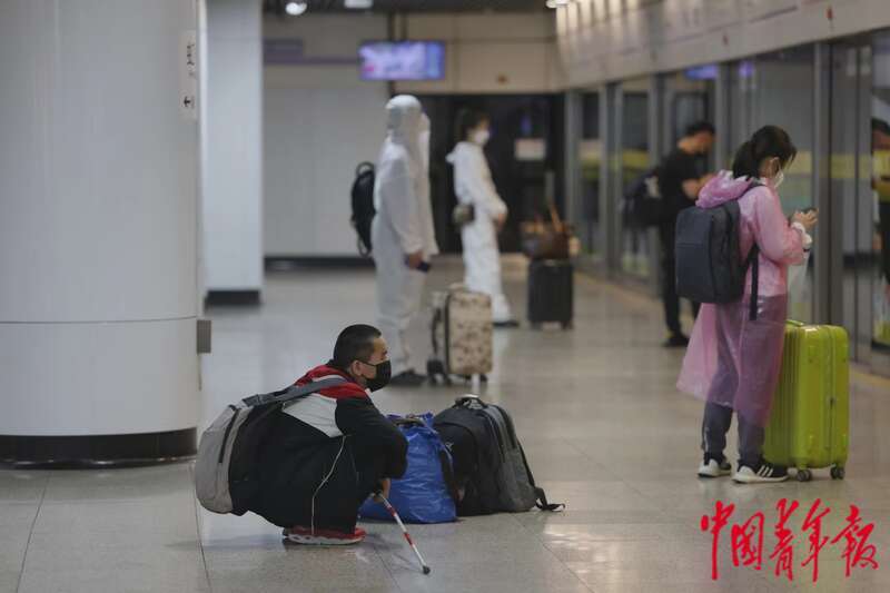 5月22日早上不到7点,中青报·中青网记者在上海地铁3号线虹口足球场站看到,地铁站尚未开门时,一名乘客就已到达地铁站入口处等待。她告诉记者,她准备乘坐地铁前往虹桥火车站,接着搭乘高铁前往南京,再转站回安徽老家。原本她打算骑自行车前往高铁站,后听闻地铁将于5月22日复运,便购买了地铁复运当天的离沪车票。记者在地铁3号线、10号线注意到,车厢内的乘客大多数都带着行李箱,准备前往虹桥火车站乘火车离开上海。