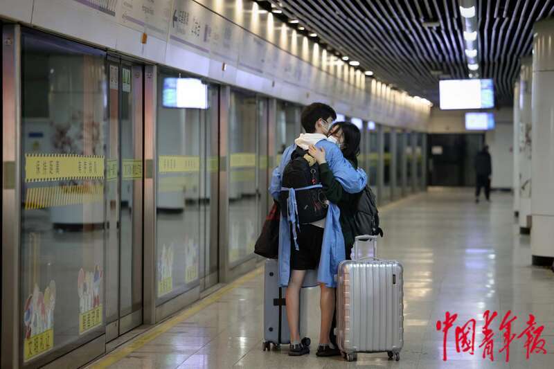 5月22日,上海地铁虹桥路站,一对大学生情侣在地铁站内相拥而别。他们从学校离开后,乘地铁回各自家中,一位住在杨浦区,一位住在闵行区。男生说,下次见面,也许要等到上海“解封”以后。中青报·中青网记者 李强/摄
